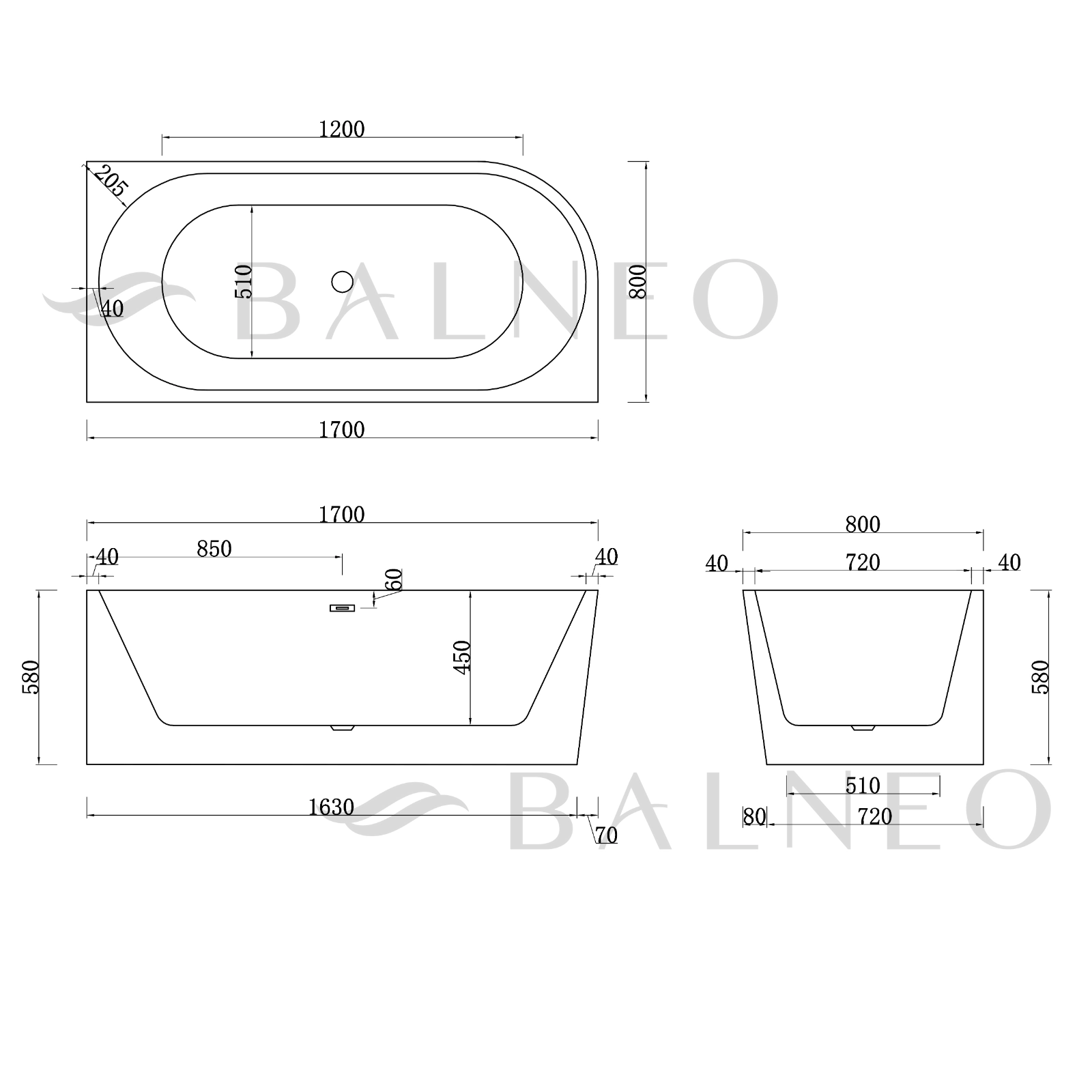 Laisvai pastatoma vonia dešininė Balneo AVOLA 170cm