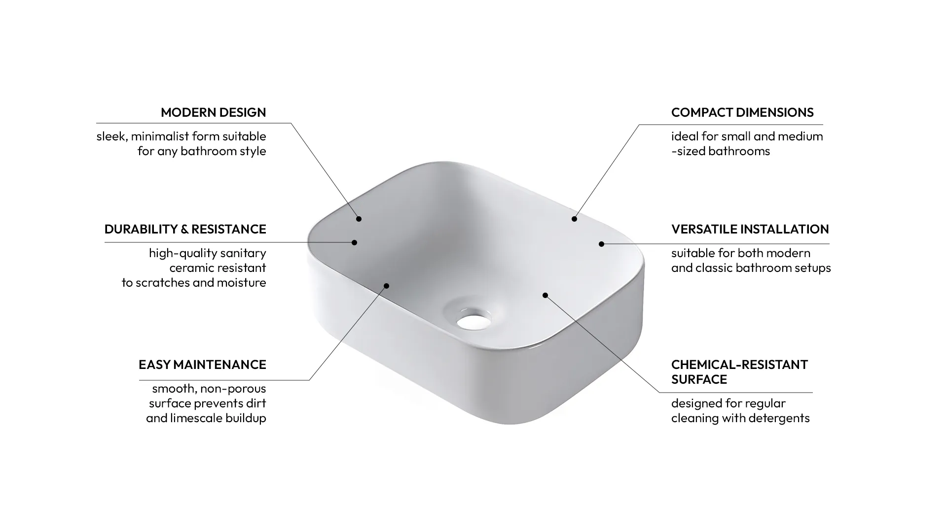Praustuvas pagamintas iš aukštos kokybės sanitarinės keramikos, atsparios drėgmei, įbrėžimams ir kasdieniam naudojimui. Lygus, neporėtas paviršius neleidžia kauptis nešvarumams ir kalkėms, todėl kriauklė yra lengvai prižiūrima ir ilgai išlaiko estetinę išvaizdą.