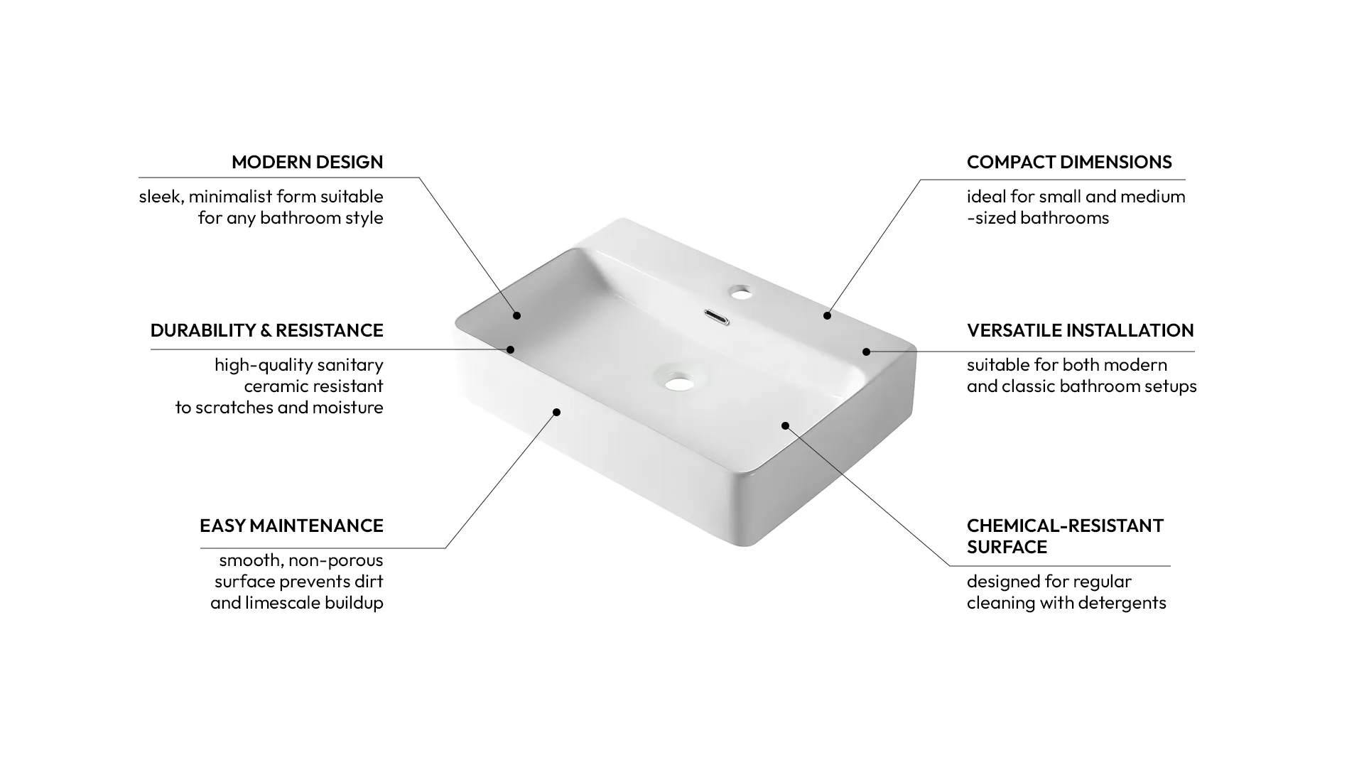 NERIA – tai modernus, ant stalviršio montuojamas keraminis praustuvas, sukurtas derinant minimalistinį dizainą, subtilias apvalintas linijas ir ilgaamžiškumą. Ši vonios kriauklė pasižymi stačiakampės formos siluetu su švelniai užapvalintais kraštais, todėl lengvai pritaikoma tiek šiuolaikiniuose, tiek klasikiniuose vonios kambariuose.