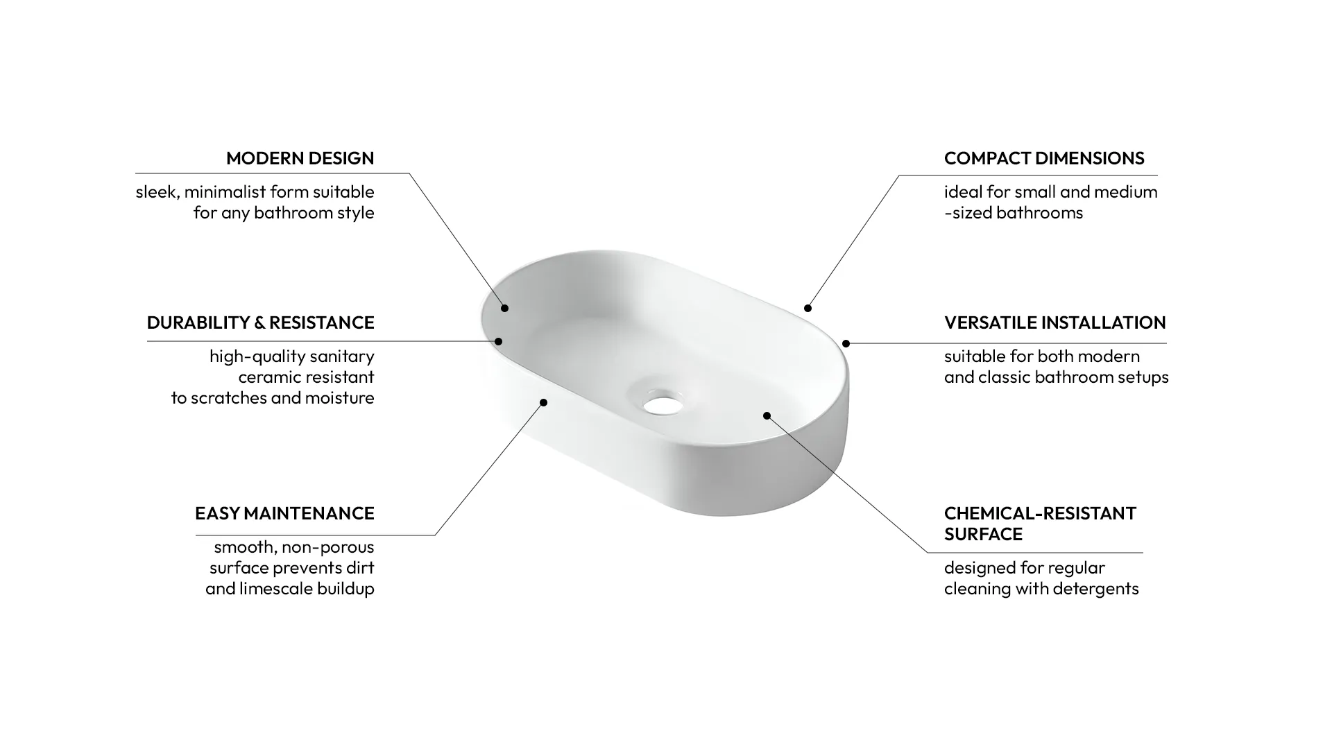 Ergonomiška pailga forma ne tik atrodo estetiškai, bet ir užtikrina patogų naudojimą kasdien. Ant stalviršio montuojamas dizainas leidžia kurti šiuolaikišką vonios kambario sprendimą, o universalus stilius lengvai derinamas su įvairiais praustuvo maišytuvais.
